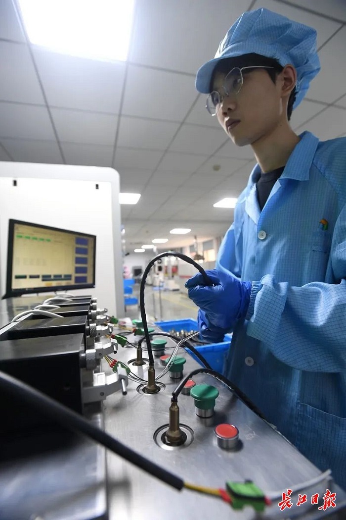 四方光電生產(chǎn)車間,研發(fā)生產(chǎn)人員正進(jìn)行高溫氧氣傳感器測(cè)試。長(zhǎng)江日?qǐng)?bào)記者周超 攝