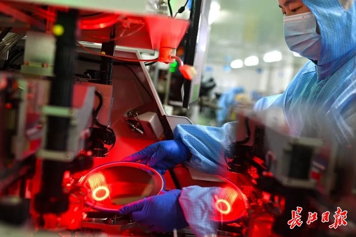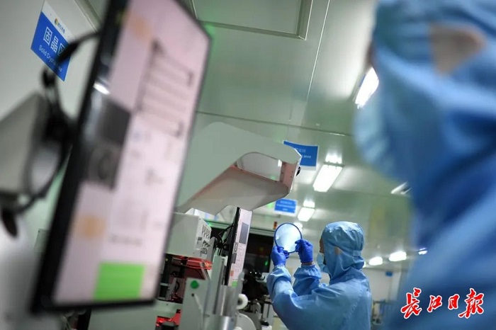 四方光電芯片車間,研發(fā)生產(chǎn)人員正進(jìn)行激光器芯片的固晶程序。長(zhǎng)江日?qǐng)?bào)記者周超 攝