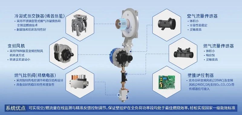 四方光電還推出了ACS智能燃燒系統(tǒng),集成了其控股子公司的燃?xì)獗壤y(精鼎電器)、冷凝式熱交換器(諾普熱能),與四方光電超聲波燃?xì)饬髁總鞲衅鳌⒖諝饬髁總鞲衅?,配合離子感應(yīng)電機(jī)和高調(diào)節(jié)比文丘里,可實(shí)現(xiàn)空/燃流量在線監(jiān)測(cè)與精準(zhǔn)反饋控制調(diào)節(jié),保證壁掛爐在全負(fù)荷功率段均處于最佳燃燒效率,輕松實(shí)現(xiàn)國(guó)家一級(jí)能效標(biāo)準(zhǔn)和環(huán)保要求。