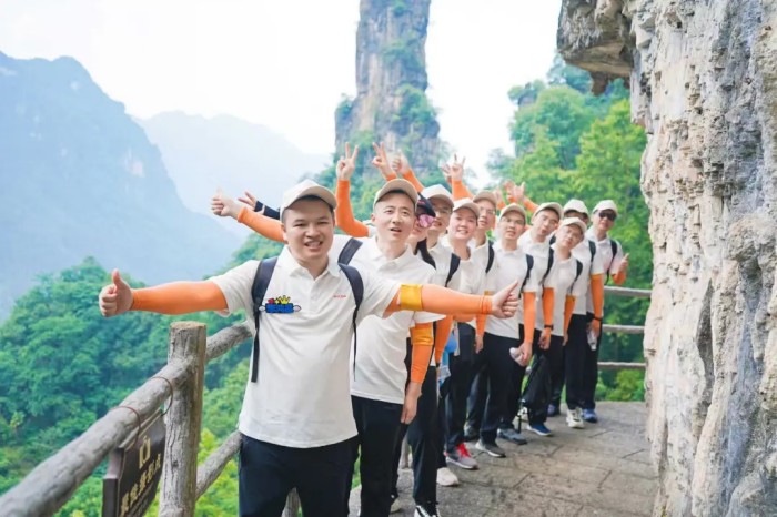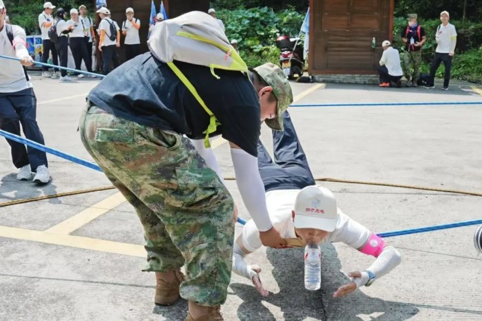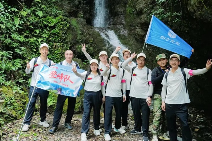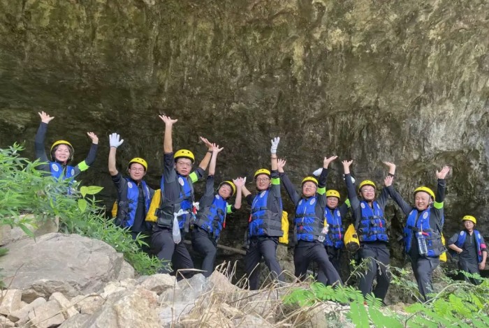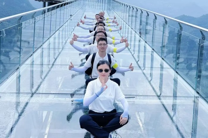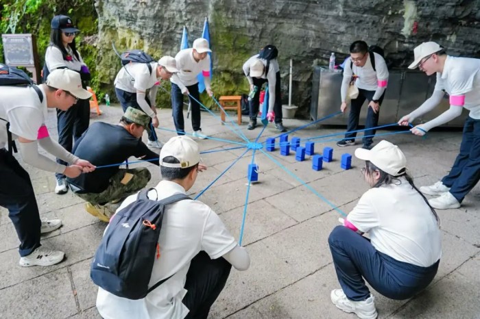 出征儀式結(jié)束后,隊員們迎來本次淬煉之旅的第一個挑戰(zhàn)——清江方山8.5公里徒步。參訓人員互幫互助,克服山路、高溫、降雨等自然挑戰(zhàn),直面懸崖玻璃棧道恐懼。行進中各支隊伍穿插完成多項團隊協(xié)作項目,在"雷區(qū)取水"中展現(xiàn)智慧與默契,在"穿越封鎖線"中培養(yǎng)信任與配合,通過"盲人方陣"磨練溝通技巧,借助"步步高升"提升協(xié)作能力。各支隊伍還圓滿完成了微電影拍攝任務(wù),大家群策群力、各展所長,用鏡頭記錄下這段難忘的淬煉時光。